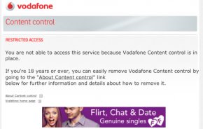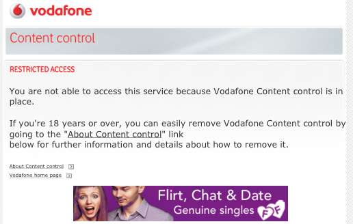A standard message received when trying to access the website states: “You are not able to access this service because Vodafone Content control is in place. If you’re 18 years or over, you can easily remove Vodafone Content control by going to the ‘About Content control’ link below for further information and details about how to remove it.”